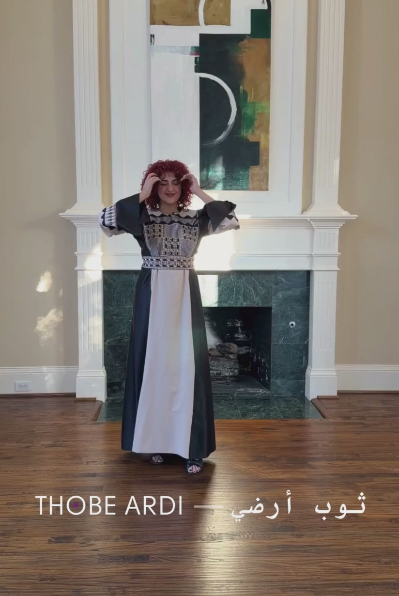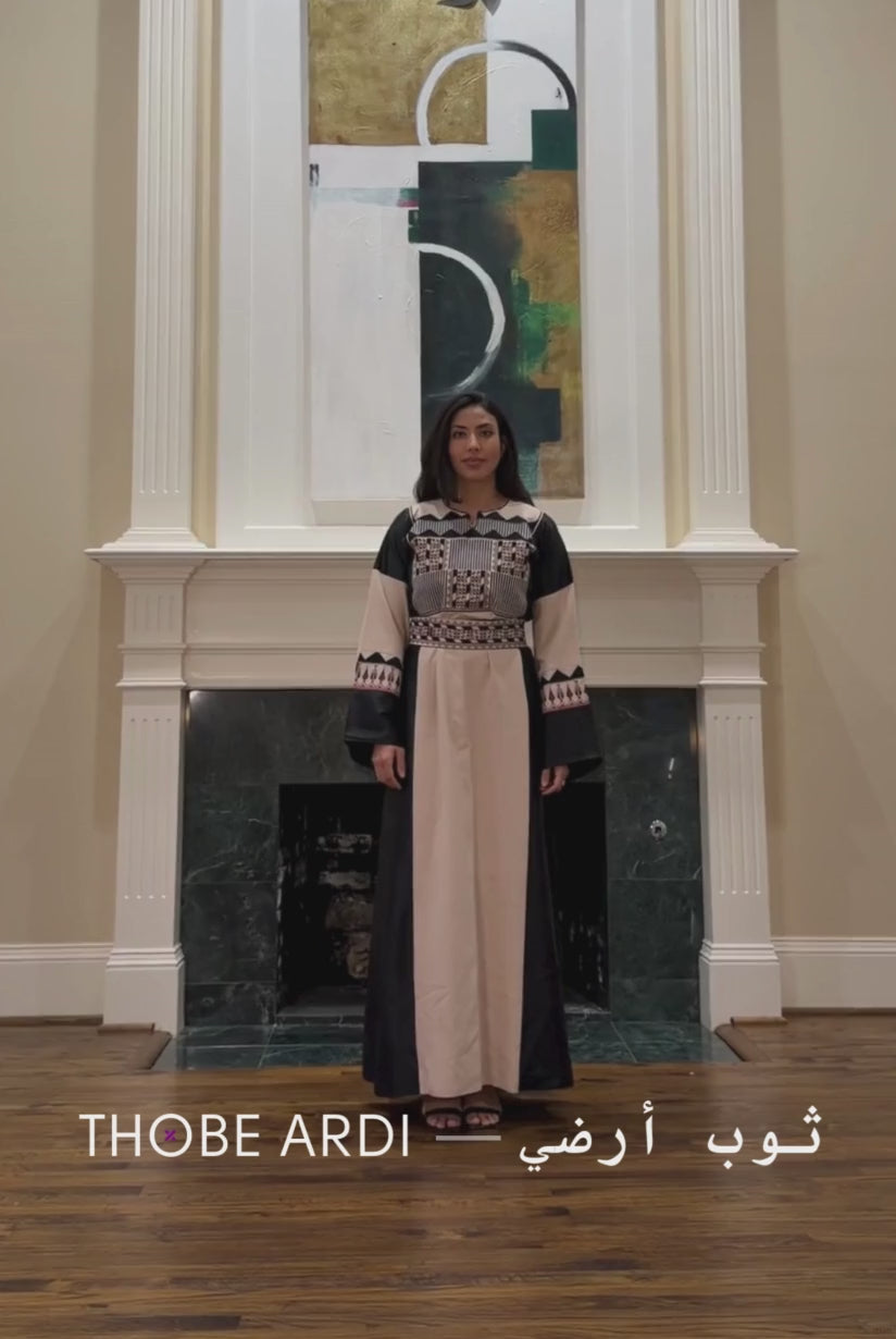 Beige thobe with black accents and tatreez. Slit sleeve details.